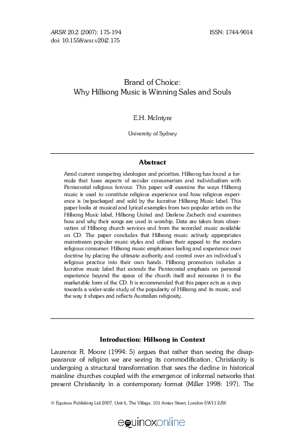 Pdf Brand Of Choice Why Hillsong Music Is Winning Sales And Souls Elisha Mcintyre Academia Edu